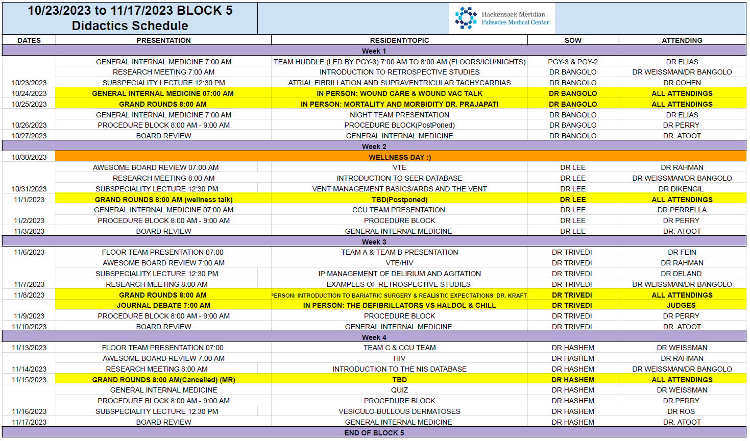 Wednesday: Grand Rounds or M&M (8-9 AM)