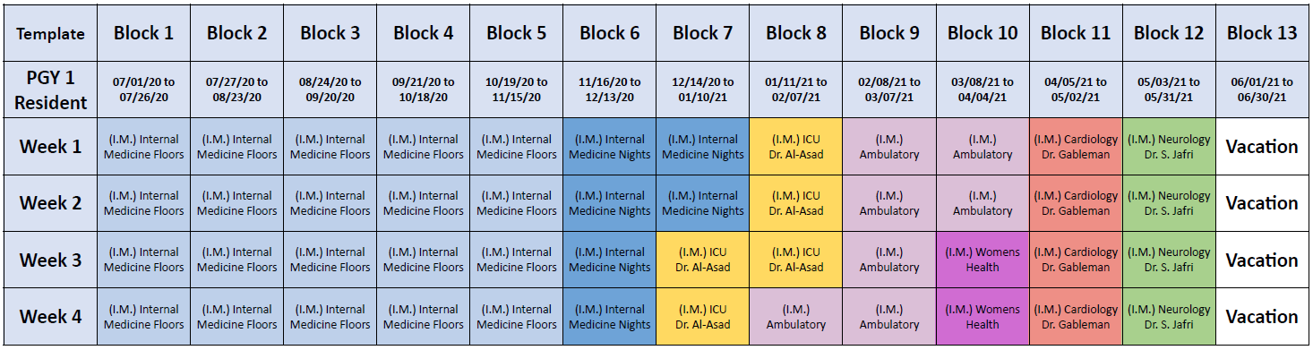 - PGY-1 year: Internal Medicine Floors (20 weeks), Cardiology (4), Neurology (4), ICU (5), Internal Medicine Night Float (6), Women‘s Health (2), and Ambulatory medicine (7).