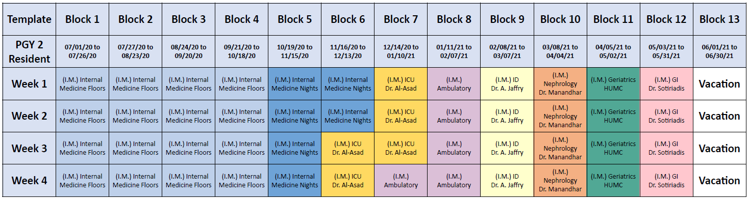 - PGY-2 year: Internal Medicine Floors (16 weeks), Internal Medicine Night Float (6), ICU (5), Endocrinology (4), Gastroenterology (4), Infectious Disease (4), Nephrology (4), Geriatrics (4), and Ambulatory medicine (5).