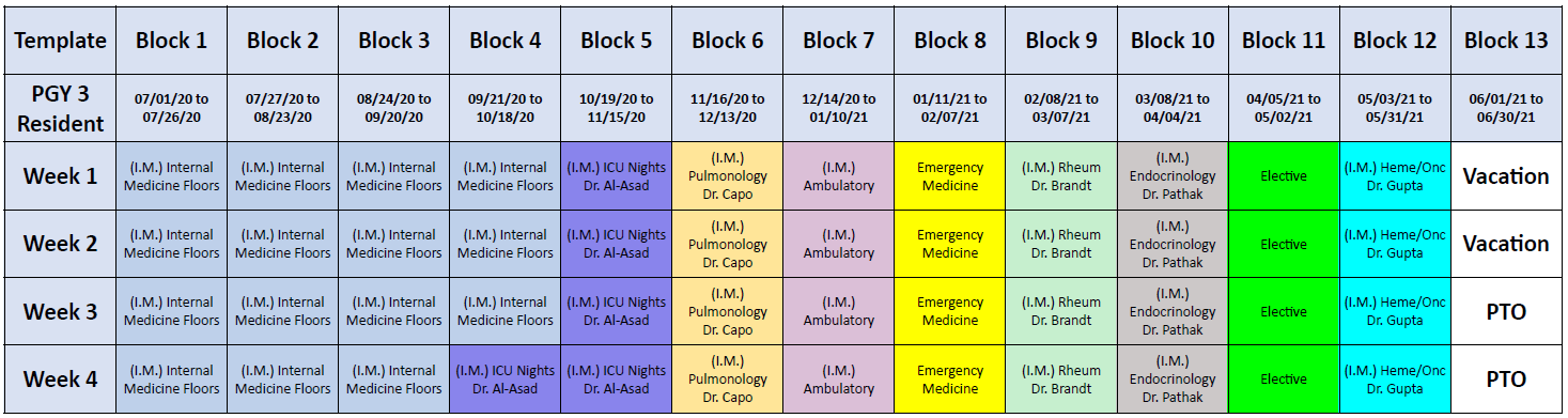 - PGY-3 year: Internal Medicine Floors (15 weeks), ICU Nights (5), Hematology/Oncology (4), Pulmonology (4), Rheumatology (4), Emergency Medicine (4), and Ambulatory medicine (4). Opportunity for 1 month outside elective (4).